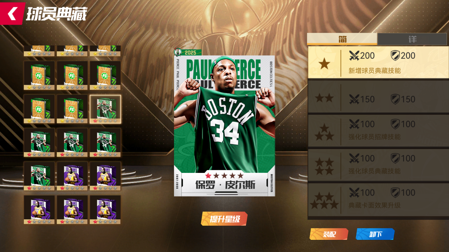 每次“抽一次”,则随机解锁一个奖励格,获取奖励格中的“球员典藏”或“典藏硬币”或“通用位置典藏”。至多抽取9次,成功将凯尔特人队皮尔斯球员典藏收入囊中!