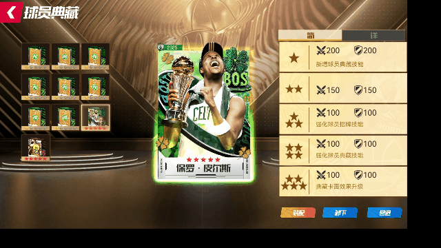 全新球员典藏卡池重磅来袭!活动期间,可使用【典藏招募函】在【典藏招募-绿军队魂】池中,获取全新皮尔斯球员典藏。