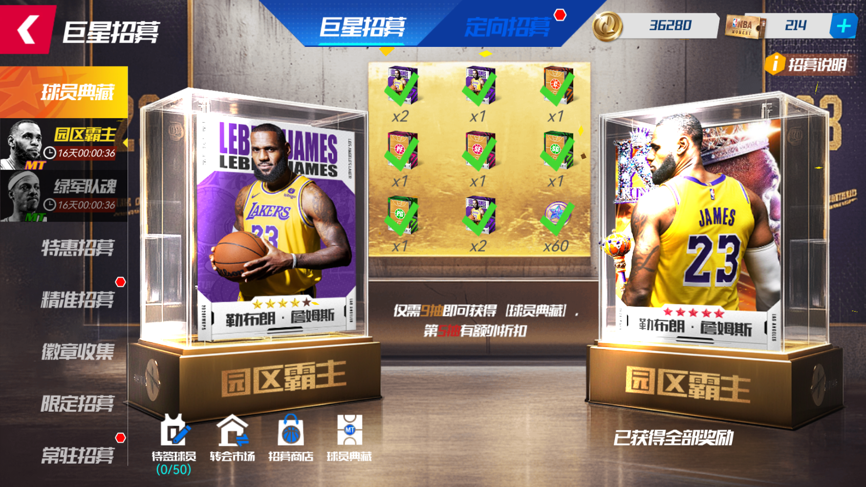 每次“抽一次”,则随机解锁一个奖励格,获取奖励格中的“球员典藏”或“典藏硬币”或“通用位置典藏”。至多抽取9次,成功将湖人队詹姆斯球员典藏收入囊中!