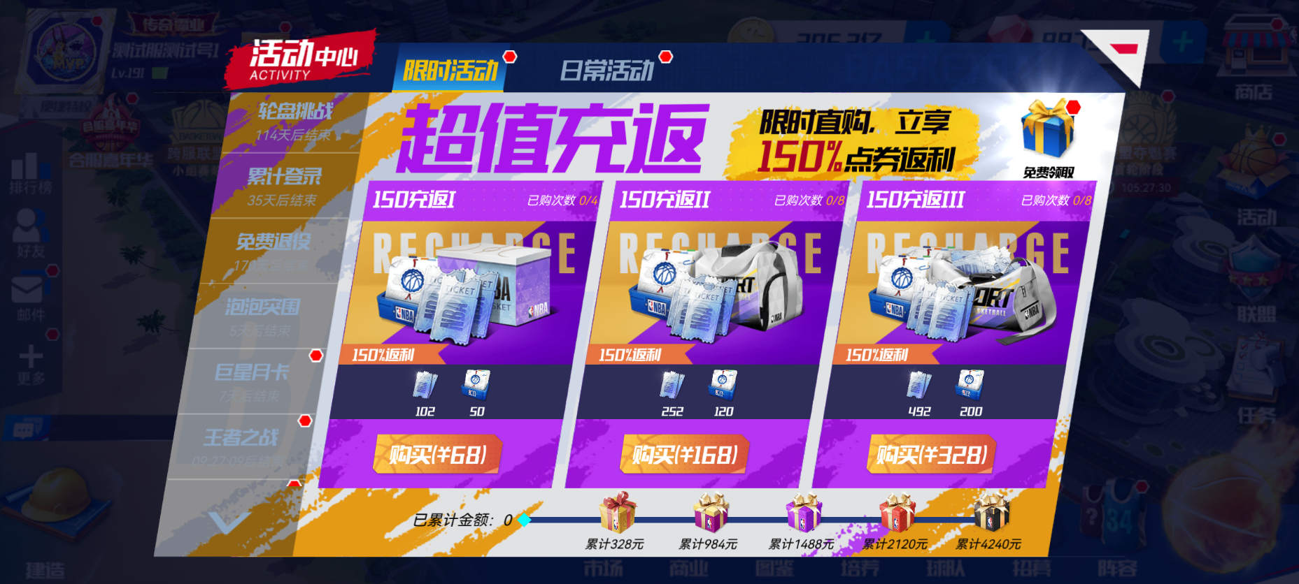 新春假期带来新福利,网页支付中心,限时返利开启,充值68、168、328档位立即获得150%点卡资源!更有【训练计划多选一】和【巨星招募函】打折兑换,【心态进阶课程】和【心态培养课程】增加限购次数!