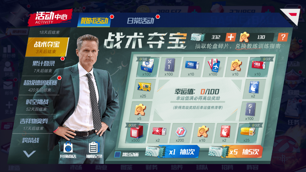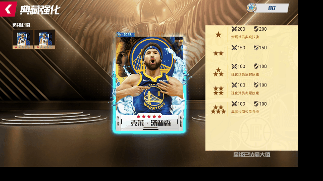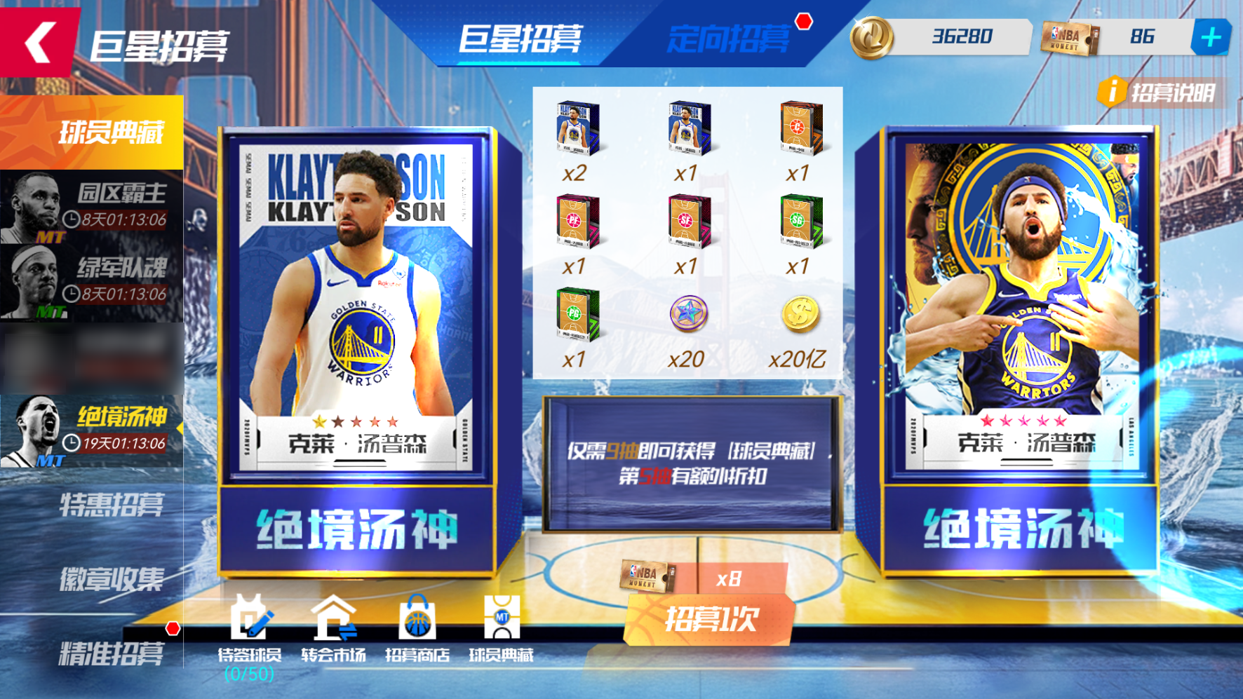 每次“抽一次”,则随机解锁一个奖励格,获取奖励格中的“球员典藏”或“典藏硬币”或“通用位置典藏”。至多抽取9次,成功将勇士队汤普森球员典藏收入囊中!