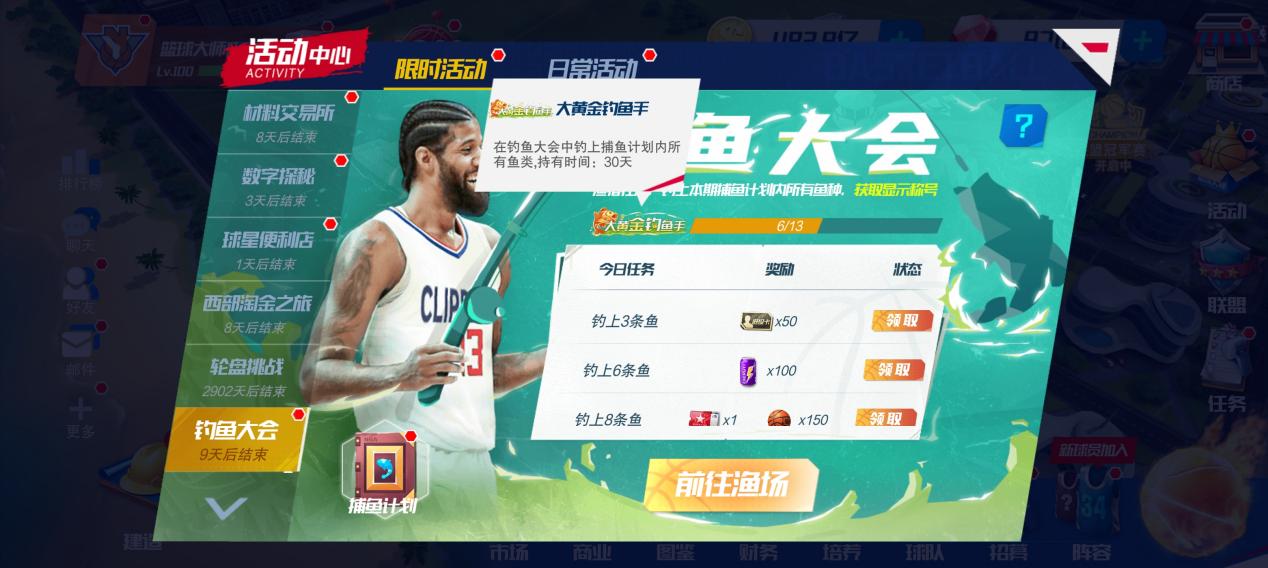 一起渔猎狂欢!在“钓鱼大会”中,每日进入大师渔场,将赠送一定数量的鱼饵,经理人可在不同的区域进行钓鱼。根据钓上的鱼类和积分,可获取对应任务奖励。