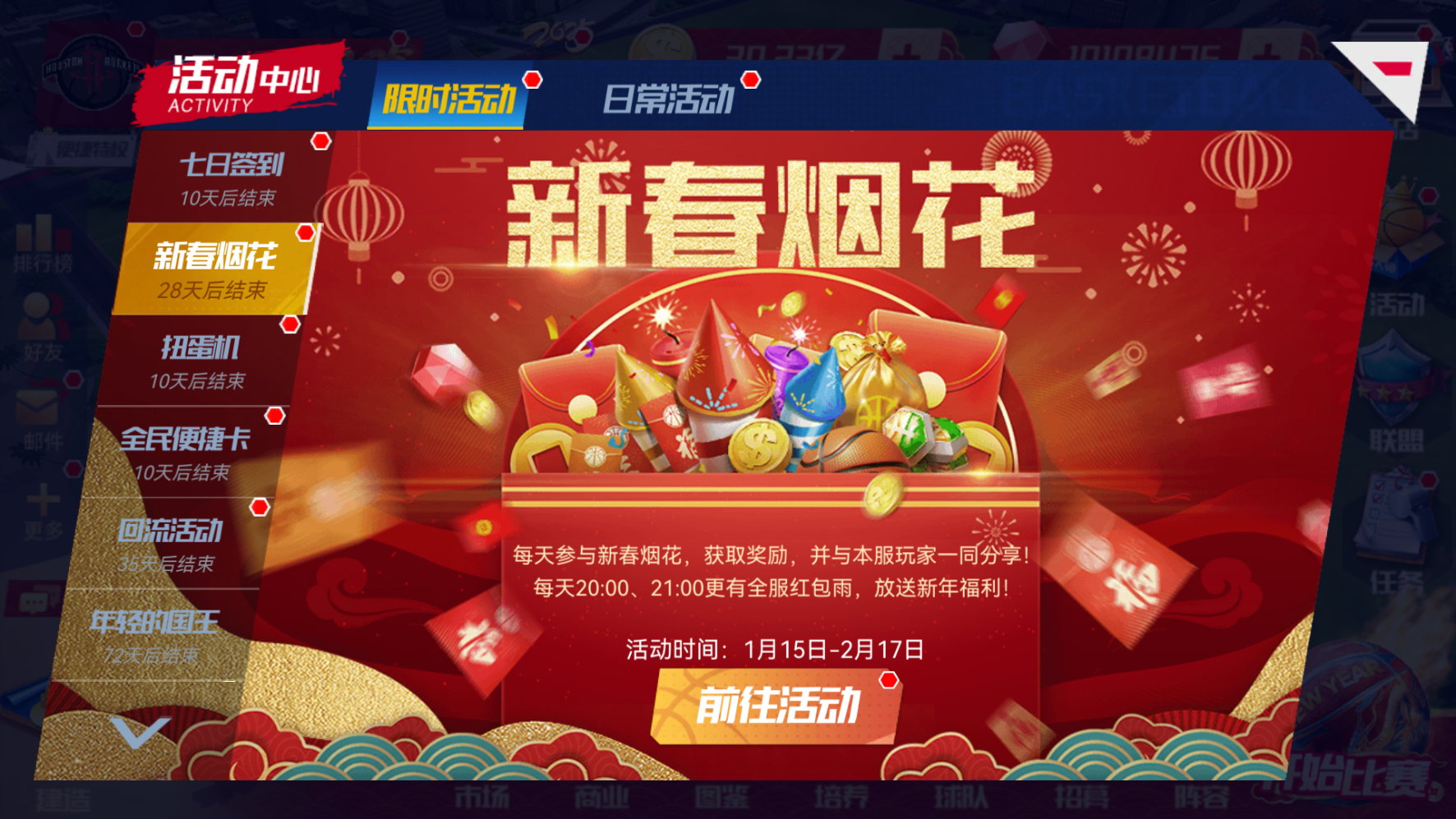 全民贺岁,共度新春,全新活动新春烟花开启!活动期间,在晚上19:00-22:00可以在活动场地燃放烟花,和全服玩家共同欣赏绚丽烟花美景。