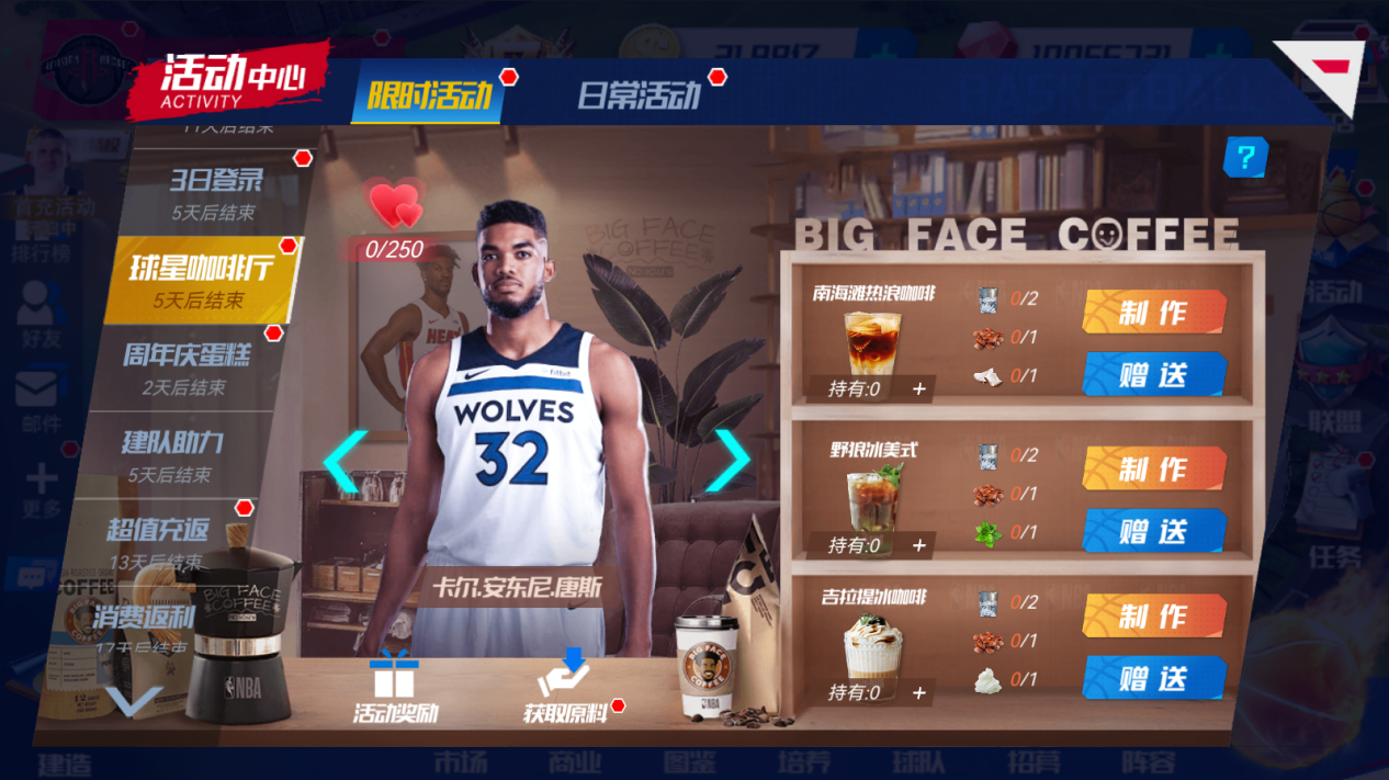 巴特勒的咖啡店正在研制新品,邀请了几个球员朋友试喝,一起来帮他忙吧!使用原料制作对应咖啡,提供给球员,看看他们好感度的变化。不同的球员对不同咖啡的喜爱程度不一样,球员好感度达到一定要求,可以在“活动奖励”中领奖哦~