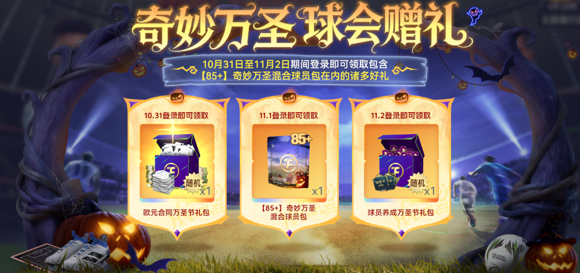 活动期间登录,即可领取万圣节资源礼包以及【85+】奇妙万圣节混合球员包。活动期间登录,直接抱走万圣节资源礼包 +【85+】奇妙万圣节混合球员包,不用 “捣蛋” 也能躺赢好礼!每天上线签个到,丰厚奖励自动上门,沉浸式解锁绿茵万圣节的奇妙惊喜~