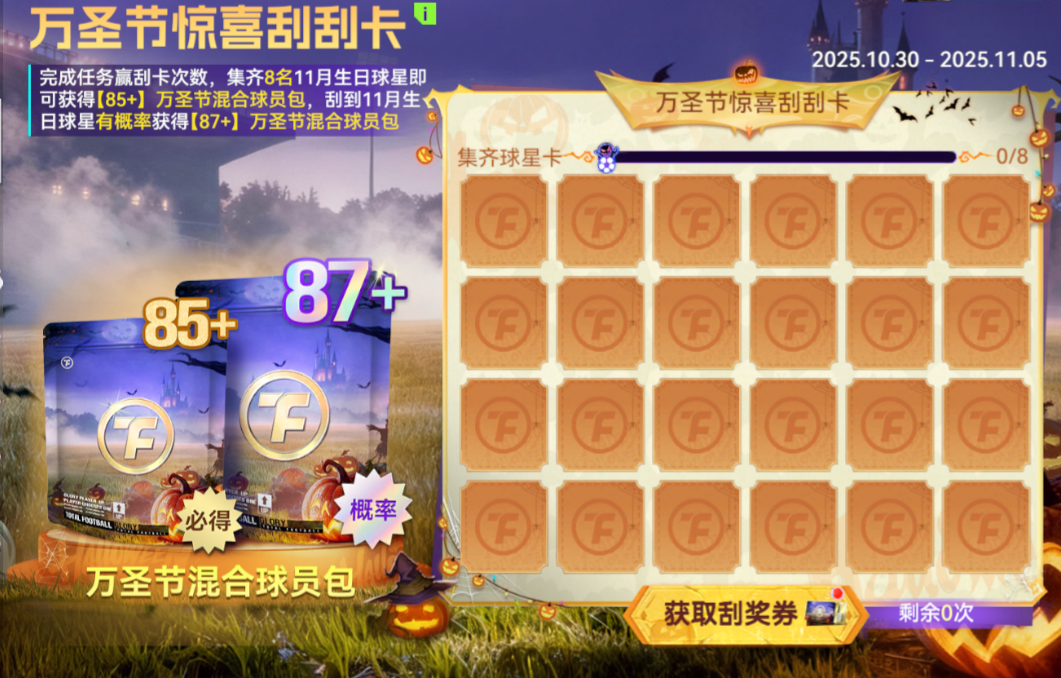 万圣节活动多多惊喜多多,更有刮卡福利加码!完成任务赢刮卡次数,集齐 8 名 11 月生日球星,必得【85+】万圣节混合球员包,刮开还能概率开出【87+】顶级球员包!10 月末尾的足坛狂欢已开启,指尖轻触就有可能抽到颠覆比赛的巨星,这份惊喜由你掌控!