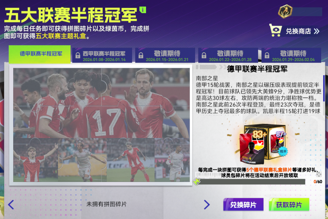完成每日任务即可获得拼图碎片以及绿茵币,完成拼图即可获得五大联赛主题礼盒。南部之星用“强势”两个字写下德甲半程答案,回望历史,26 次半程登顶,23 次最终加冕,拜仁已经把“冠军领跑”写进基因。 参与每日任务,拼出荣誉拼图开启礼盒——把优势变成胜势,打造属于你的冠军之路。