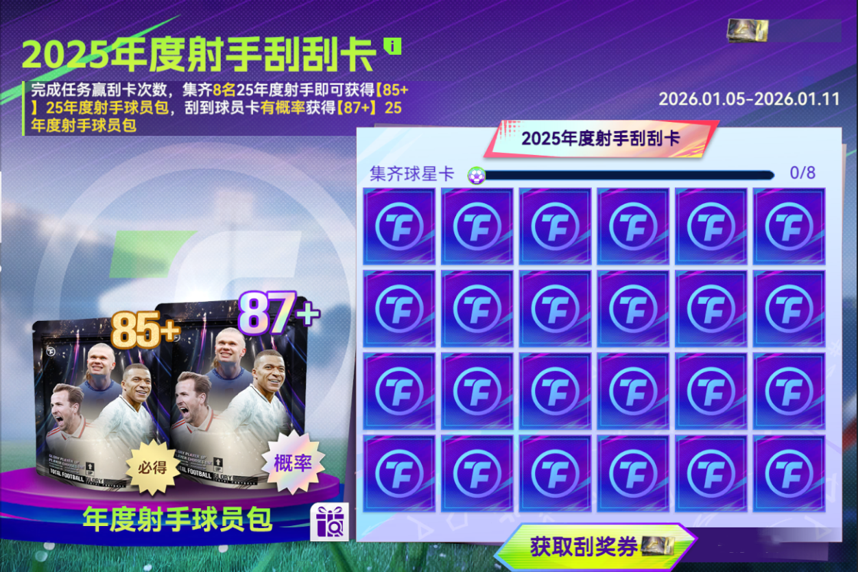 完成任务赢刮卡次数,集齐8名25年度射手即可获得【85+】25年度射手球员包,刮出球员卡有概率获得【87+】25年度射手球员包。每一次刮开,都有机会出现一位年度射手,参与活动就有机会把顶级火力收入囊中,让你的球队在任何比赛里都能所向披靡!