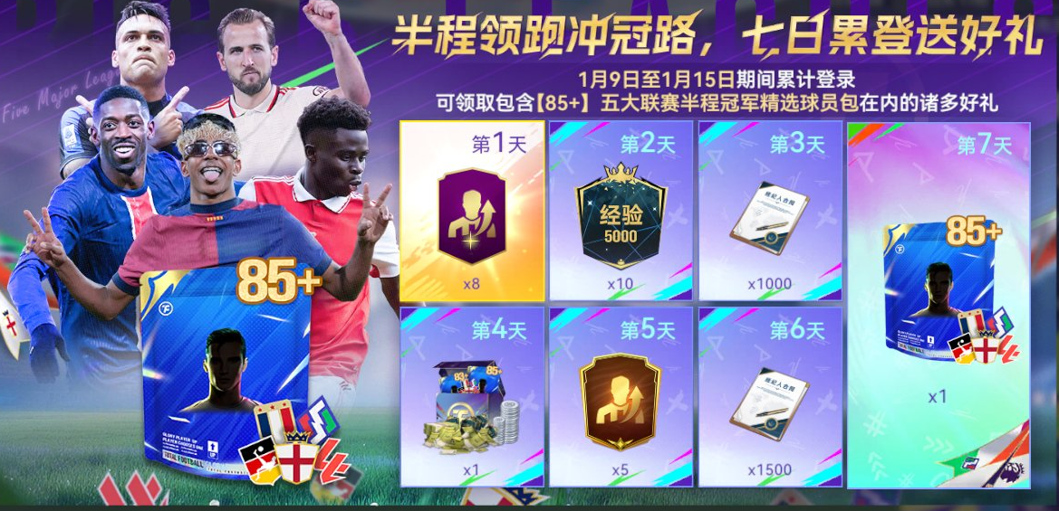 新年福利第一弹!1 月 9 日至 15 日,只要累计登录,就能把【85+】五大联赛半程冠军精选球员包等丰厚奖励收入囊中!告别旧岁,足坛新篇即刻开启!福利加速派送,助力各位主帅新年焕新阵容,连续登录解锁惊喜,下一个赛场传奇由你缔造!