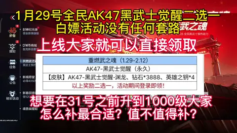 1月29号全民AK47黑武士觉醒二选一活动没有任何套路,上线大家就可以直接领取,想要在31号之前升到