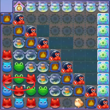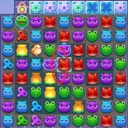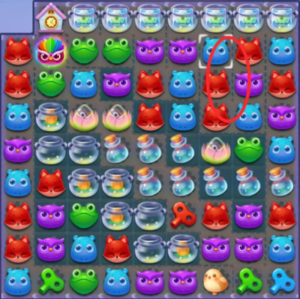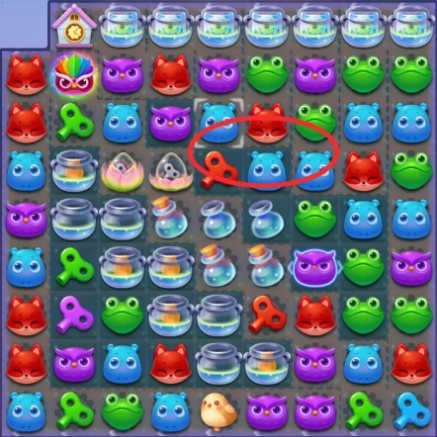 1:三消消除击打冲刺鱿鱼,借助冲刺鱿鱼向下消除萝卜仔打开缺口,右上第三列小松鼠位置会每三步翻转一次注意节奏