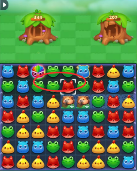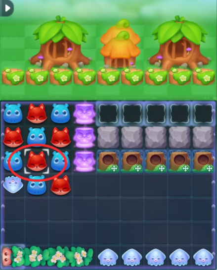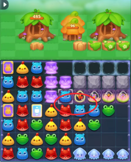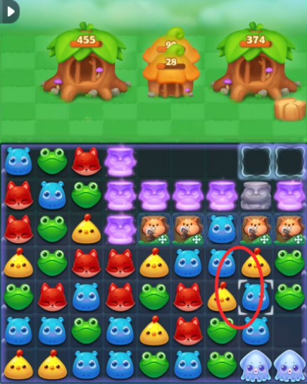 3:三消击打小松鼠可助力消耗大树屋的血量,同时赶走底部的冲刺鱿鱼,如果可以待翻转后激活冲刺鱿鱼,小松鼠可以保留助力消除