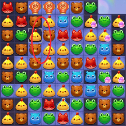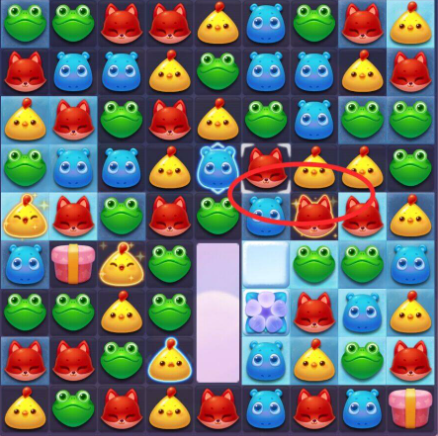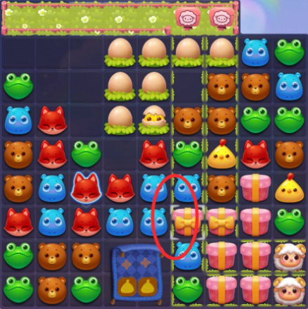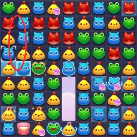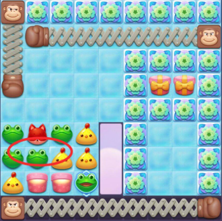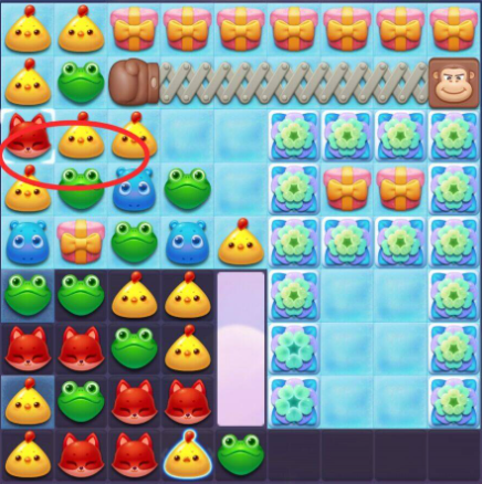 4:收尾时以三消消除为主,可优先在底部进行消除,上方的动物掉落下来几率触发连消消除,消除棋盘内剩余的雪块