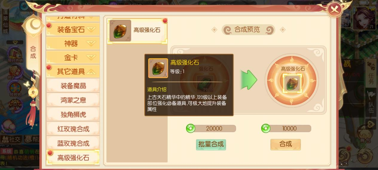 大家可以通过各种途径获得,例如:水玉商店,帮派商店,装备副本,门派闯关等等方式进行获取。而当装备高于120级时,则需要对强化石进行合成,成为高级强化石,来对装备进行强化。糖小妮认为获得的属性加成还是非常可观的哦。