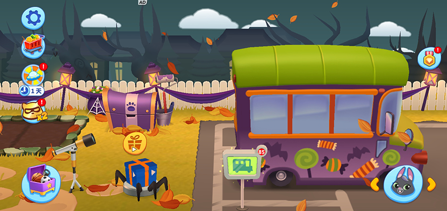 冰箱被缠满了绷带,浴缸变成了笑脸南瓜,地毯上布满蝙蝠印记......换上万圣节主题的沙发、地毯、冰箱、浴缸以及糖果巴士,把氛围感拉满!