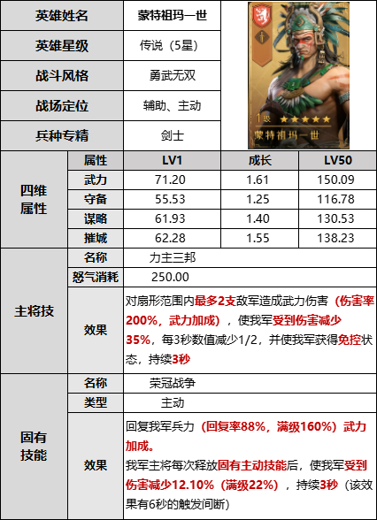 蒙特祖玛是很明确的辅助定位,固有主动技能里隐藏了一个被动技能,我军每次释放固有主动技能后减少受到的伤害,当肉队体系完善的时候相信这个英雄会成为不可替代的一环。