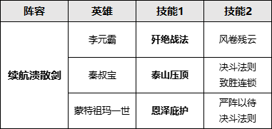 (2)技能方面李元霸歼绝战法属于较核心的技能,能不能输出就看主C的技能释放。其次秦叔宝负责挂状态,包括溃散和自身的增益。蒙特祖玛则负责减伤和回复。3人分工明确,效果想必不差。