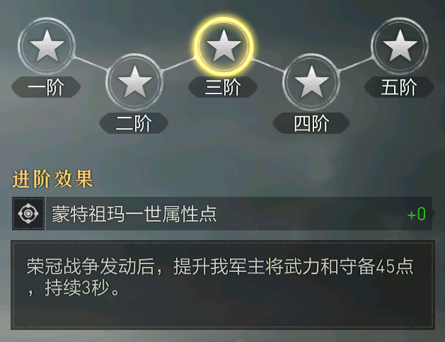 蒙特祖玛属性面板比较平均,重点在武力和摧城上,辅助层面上来说四维属性的确是充足了,其次三阶的进阶效果加成极高,比较适合真伤剑。