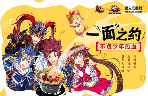 在美食领域,《少年三国志》系列游戏与国潮面食品牌《唐人吃面牌》进行了跨界合作,推出了两种定制口味任少年选择,绿毛血旺让你?口刺激到释放超强技能,香辣口味让你?口就能在原地满血复活!让我们不负一“面”之约,燃起这个夏日吧!