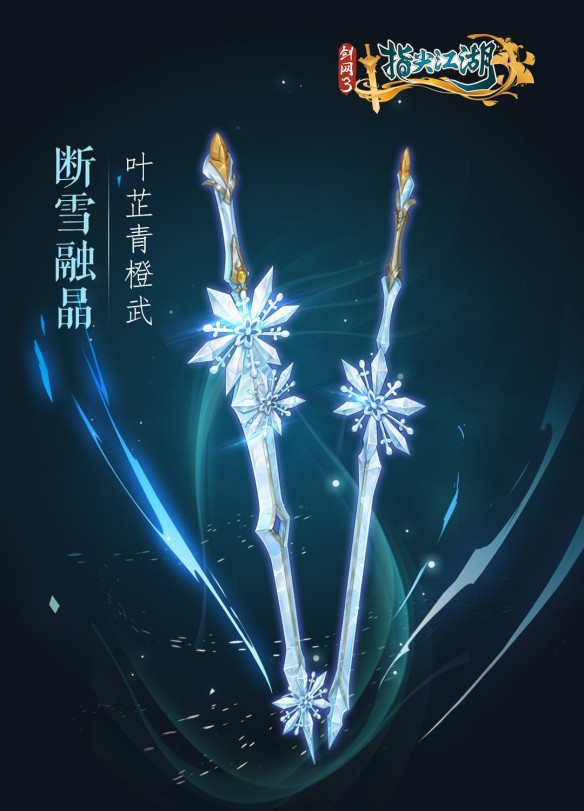 铸剑世家藏剑山庄为七秀订制的剑器之一。其原料质地坚硬,色泽雪亮更胜白银,便依着六棱冰花设计锻造而成,舞之端的是香雪缱绻,江海凝光。同七秀其他几人的原是一套,小七因此十分爱惜,从不肯轻易示人。