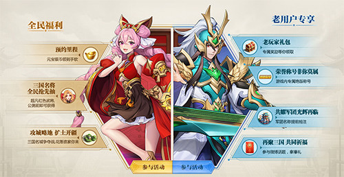 《放开那三国3》公测海量福利放送,助力乱世征程。登录即送50连抽!公测预约热度火爆,预约人数破百万,里程碑奖励现已全部解锁,预先锁定海量元宝、绝版头像框等超值奖励!现在预约还可抢先抽高资质红将,通过老玩家认证更能领取专属礼包,享受军团名称抢注及绝版称号等福利!