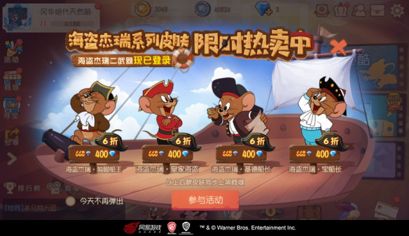 船长到齐,限时热卖 为庆祝海盗杰瑞二武器登场,在8月20日至30日活动期间,海盗杰瑞的四款A级皮肤“独角船王”“皇家海盗”“基德船长”“宝船长”全部上架,并打出6折优惠,只需要400钻石就能收入囊中!而对应四款皮肤的彩饰也同步上架,可以通过活动获得的自选礼盒获取,也可以用皮肤精华购买。快来选购心仪的皮肤和彩饰吧!