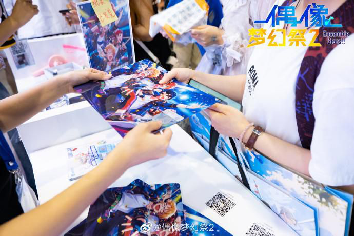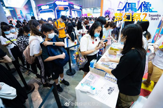除了各种周边贩售回归,《偶像梦幻祭2》官方也将宠粉进行到底,现场有各种周边赠送!关注官博及b站官方账号即可获得角色透卡;在微博或b站动态中发布现场照片,即可获得精美文件夹;现场预约扫码,即可获得精美纸袋。制作人们大排长队,现场气氛火热难挡!