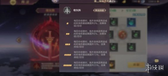 分析:回合结束时触发伤害增加机制,但在战斗一开始是无法触发的,所以,突突队搭配这个阵法的收益远没有天象队大,所以,锋矢阵既不适合开局爆发的队伍,也不太适合肉盾队或者六辅队的使用。