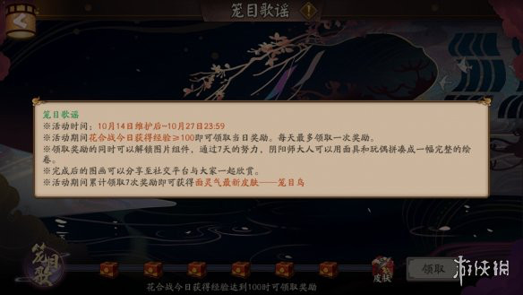 活动期间15级以上的阴阳师大人花合战今日获得经验≥100即可领取当日奖励。每天最多领取一次奖励。领取奖励的同时可以解锁图片组件,通过7天的努力,阴阳师大人可以用面具和玩偶拼凑成一幅完整的绘卷。