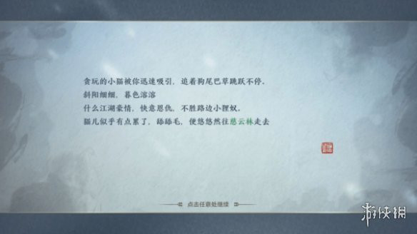 第四次撸猫这只猫真是吃饱了就往外跑啊,这一次跑到了郊外慈云林,这次不好找,但是会发现只叫大黑的狗,与大黑对话可以触发【奇遇:后院藏宝】,而这只猫就藏在大黑旁边的小房子角落。