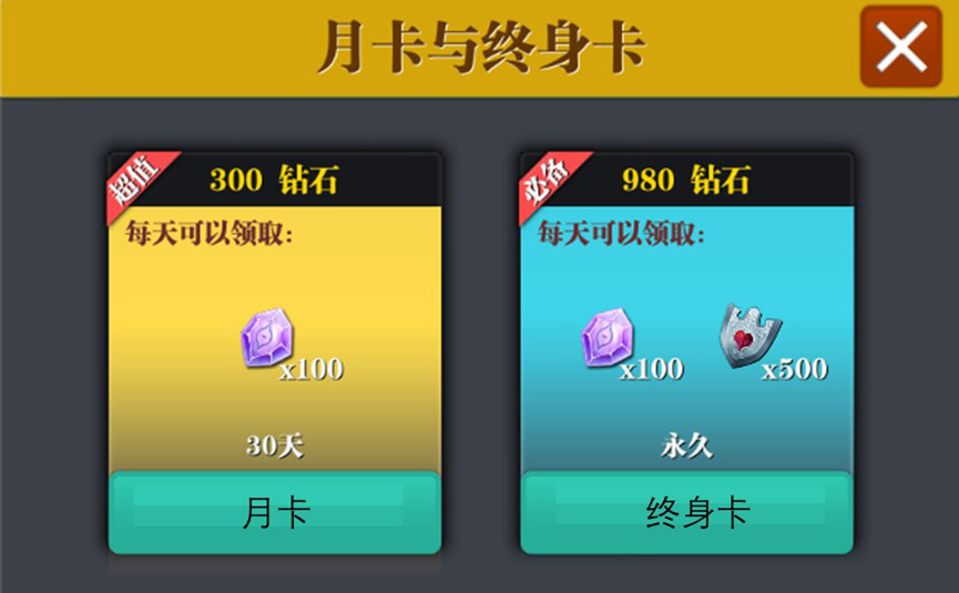 【新增月卡、终身卡功能】 游戏中将上线新的月卡和终身卡,购买后每天上线都可以领取100钻石,终身卡每天还能领取500印记。可以同时拥有月卡和终身卡,每日奖励叠加。