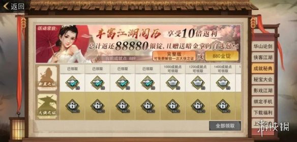 活动奖励:免费解锁获得880银锭,充值880金锭后还可开启大侠之证,总计返还88880银锭+暗金掌门自选包!