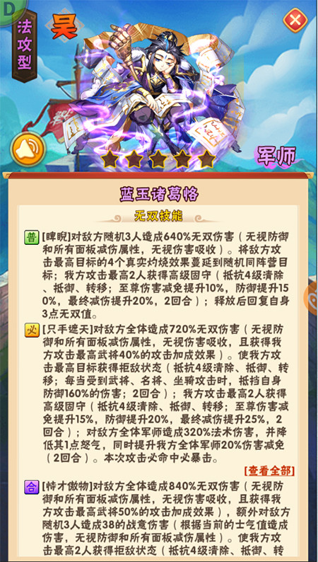 蜀国军师协穆马良与诸葛亮共佐蜀汉大业,作为玄金军师的他,拥有多重增益技能和士气回复能力。众所周知,战斗中的士气影响着军师的伤害/增益,协穆马良的高士气回复能力,可极大提升蜀国武将的伤害强度,从而使我方主力给敌方带来毁灭打击,碾压战场,势不可挡。