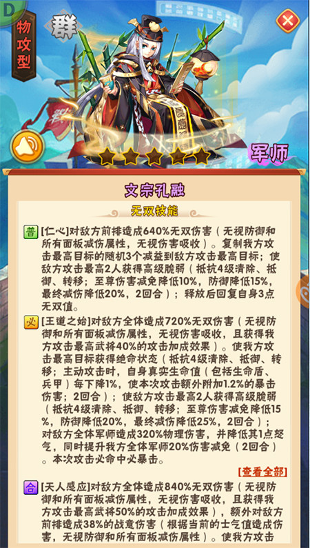 群雄军师文宗孔融是建安七子之一,加入到少年三国世界后,化身成为玄金军师。他的大招含有免死机制,可极大提升群雄阵容的存活能力。同时,文宗孔融技能的还拥有超强的爆伤输出能力。搭配阵法中的爆裂增益,武将打击时可概率将当前总爆伤翻倍,爆伤+免死保命,可谓能扛能打,实力不容小觑。