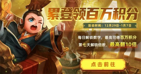 四重福利限时开启 百万积分等你领 狂欢活动少了积分怎么行?12月29日-1月7日期间,《英魂之刃口袋版》百万积分大放送!玩家只需要每天登录游戏,即可由系统随机解锁一位积分位数的数值,最高可获得9999990积分!喜欢逆天改命的玩家还可以重置刷新数值,见证欧气的时刻到了!