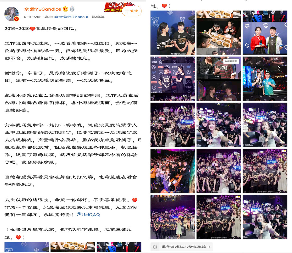 不单单是职业选手,很多职业解说也在Uzi官宣退役以后发文来表示对Uzi的不舍,我们众所周知的解说余霜就特意发文怀念了四年来与Uzi共同经历和一些难以忘却的回忆片段。
