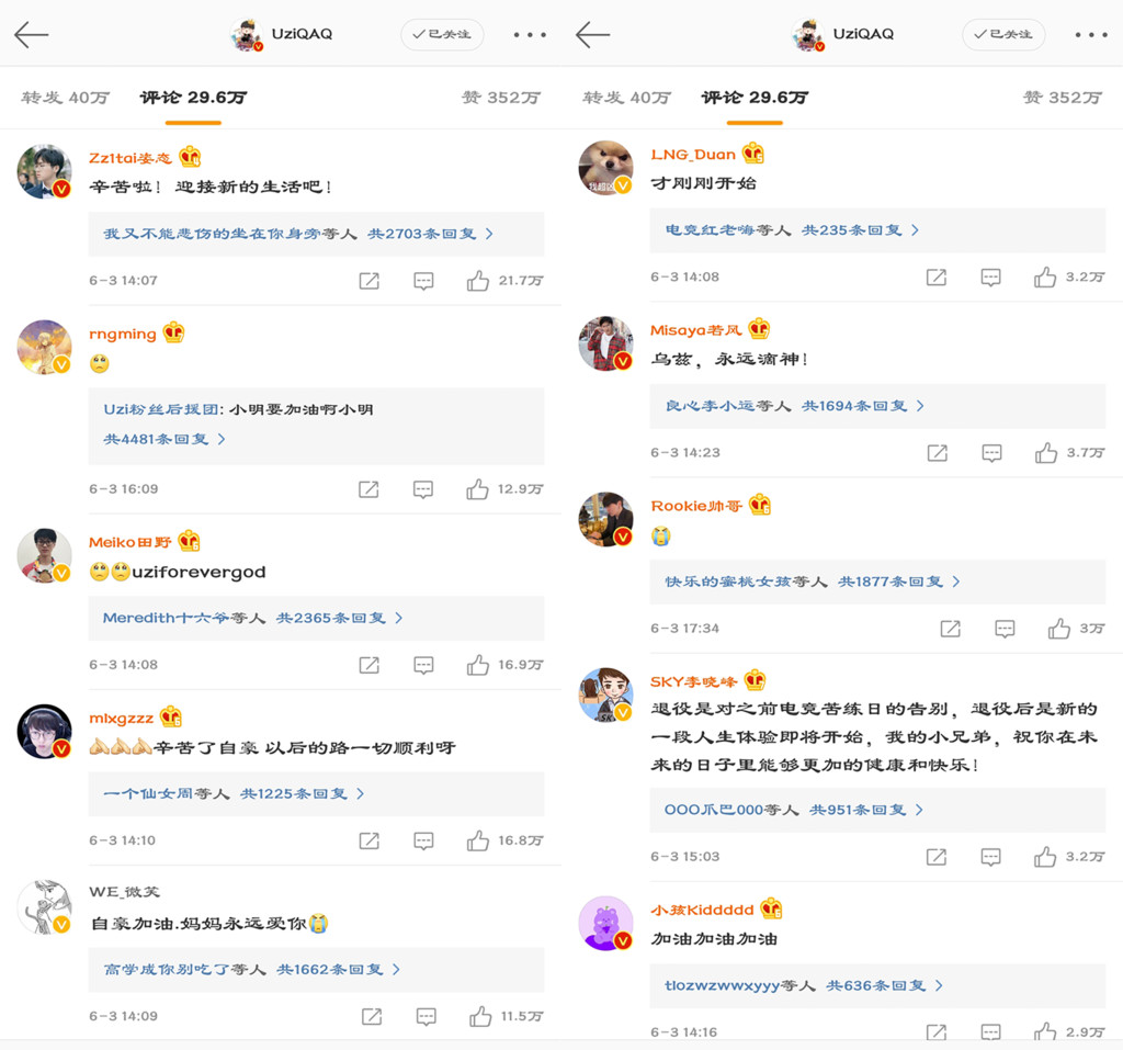 这段时间关于Uzi的话题不断登上微博热搜。RNG公布夏季赛大名单Uzi不在其中引起的网友热议还没平息,Uzi本人就官宣了选择退役的消息以及原因,这一重磅消息的公布,迅速引爆全网。大家一边为Uzi征战LPL8年未尝S赛冠军而感到惋惜遗憾,一边又为Uzi身体的病痛感到担心,那么得知Uzi退役的消息以后,他的队友们都作何回应了呢?