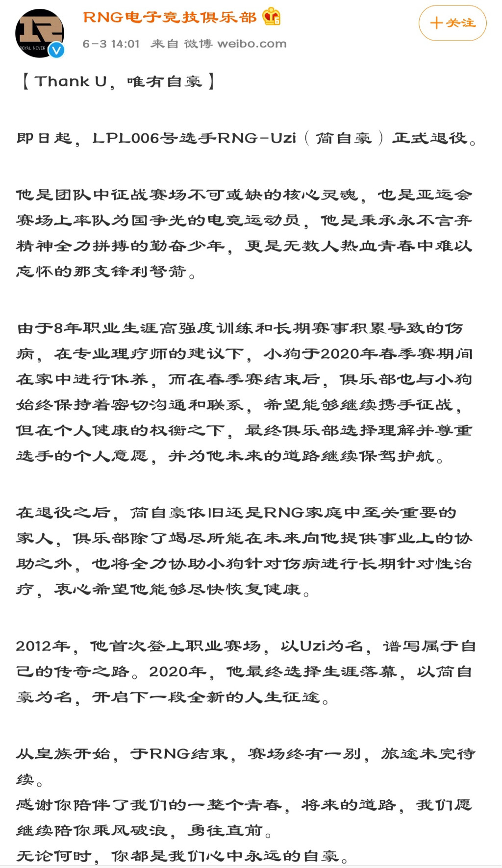 就像RNG官博发布的公告中说的那样,希望Uzi在退役后能够积极接受治疗,保持身体健康,在接下来的日子里越来越好吧!