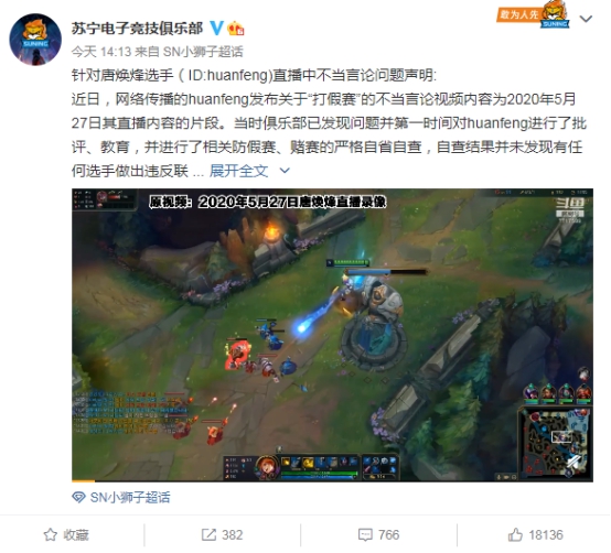 但这个事情从5月份到现在,huanfeng本人依旧还没有出来到道歉,以至于事情发展到现在局面,SN战队才自己站出来官宣道歉。没有第一时间站出来说明问题,5月份的直播现在才做解释,个人感觉huanfeng的路人缘又被降低了。