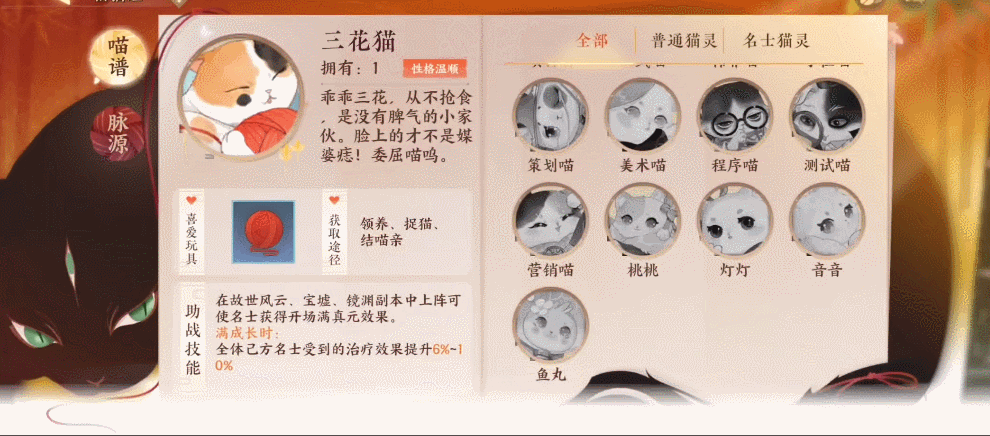 玩家能在战斗中捕获各种造型不同的猫咪,通过日常喂猫和撸猫来提升好感度,后续还能够通过猫咪的配种来培育更多花色的猫咪,而且越稀有的猫咪还能带来属性上的加成。能在《忘川风华录》里云养猫,不得不说这波操作是真的太秀了。