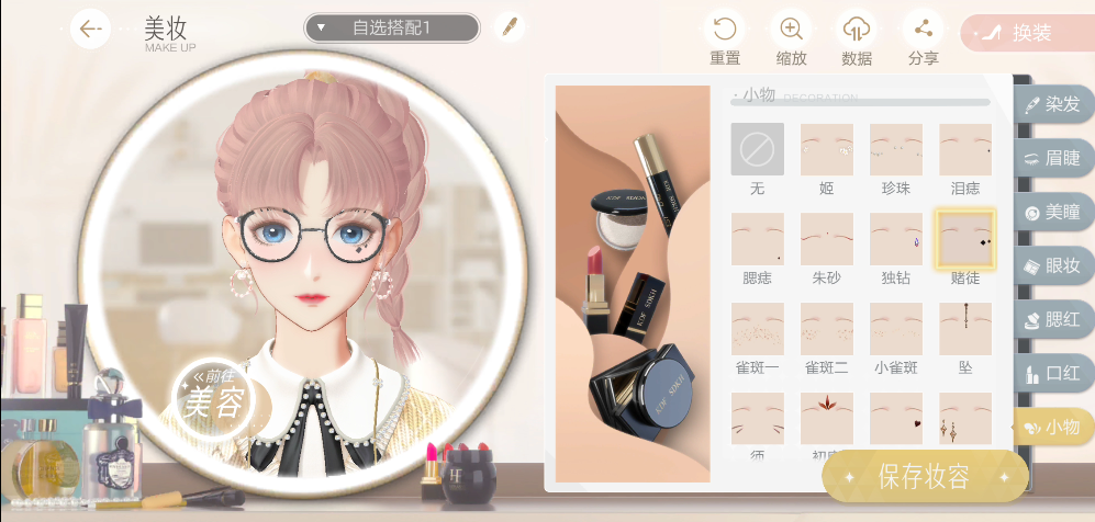 玩家除了一开始的角色装扮之外,还可以通过【美妆】玩法对自己进行化妆。不仅可以染发、画睫毛、带美瞳,还能自定义口红和小物等装扮。