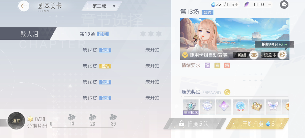 通过剧本界面,玩家可以进行剧本演绎。每一份剧本都有很多独立的小关卡,完美通关之后就能够获得许多成长资源。玩家除了通关小关卡可以拿奖励以外,每攒够一些星,就可以拿部分片酬。并且剧组还有盒饭奖励,半小时能收割一次经验和星币(类似于金币的游戏道具)。当玩家杀青了一部戏之后,还可以源源不断的获得收益,这就和在现实中拍戏一模一样。
