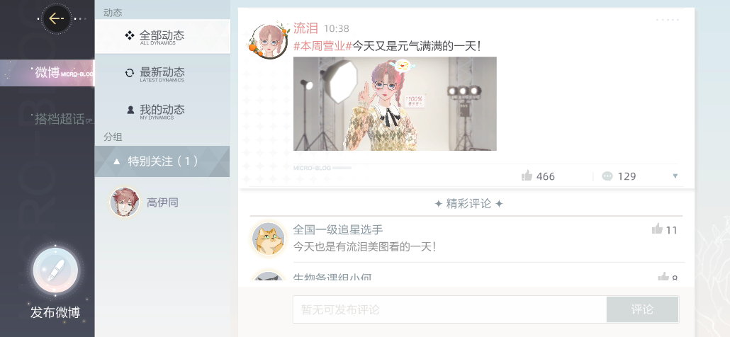 在《绝对演绎》中,玩家甚至可以发微博。是的,只需要在游戏中自拍一张,就可以搭配超话上传到自己的微博中。而微博下放同样会有很多“粉丝”的留言和点赞,感觉就是对现实生活的完美还原。