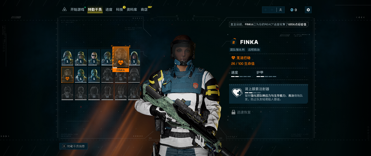 在游戏的初始阶段,玩家们只能使用其中的9位干员,随着任务的完成和经验的积累,不同的干员和每个干员们所使用的的不同武器也会随之解锁,这点也比较符合当下设计类游戏的成长模式。除此之外,因为游戏的玩法模式上有了不小的调整,为了更好的配合三人团队作战,《彩虹六号:异种》还针对不少干员的特殊技能进行了微调,主要是将一些使用次数有限制的技能改为了时间冷却方式,比如大部分的治疗或激素增强类技能,方便玩家们在游戏中适时、多次使用。