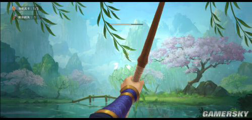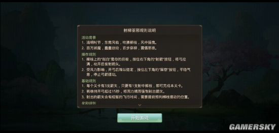开始射柳游戏,面前会有柳枝随风摆动,道友们瞄准柳枝上白色的一段,射中柳枝即视为本关成功。每关会有三支箭矢,只需要成功射中一次就可以过关。