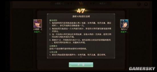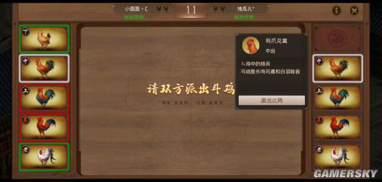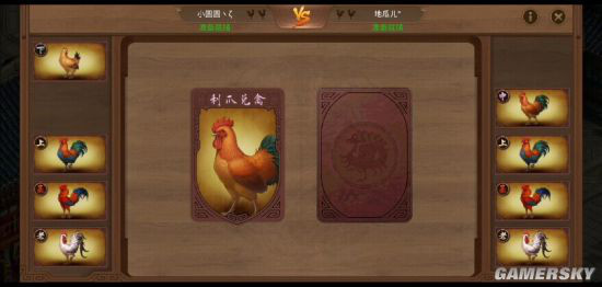 每局双方各出一只斗鸡,选择完毕同时显示所派出的斗鸡,根据斗鸡之间的强弱关系,被克制的斗鸡消失,存活的斗鸡回到手牌中可继续参战。