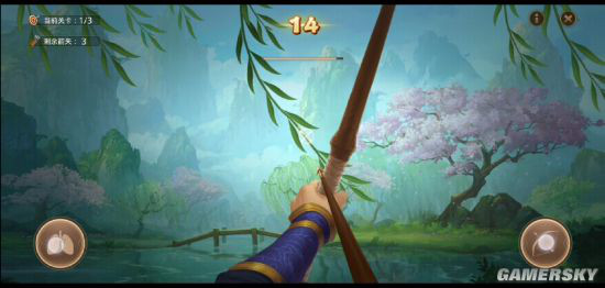 道友们长按右下角按钮拉开弓,不过单纯开弓会有些晃动,这时使用左下按钮进行屏息,可以使瞄准更稳定。接下来就需要各位预判柳枝的摆动和箭矢飞行时间,以射中目标了。另外需要注意,如果拉开弓超过15秒,箭矢会因角色力竭而自动射出,因此要注意时间哦。