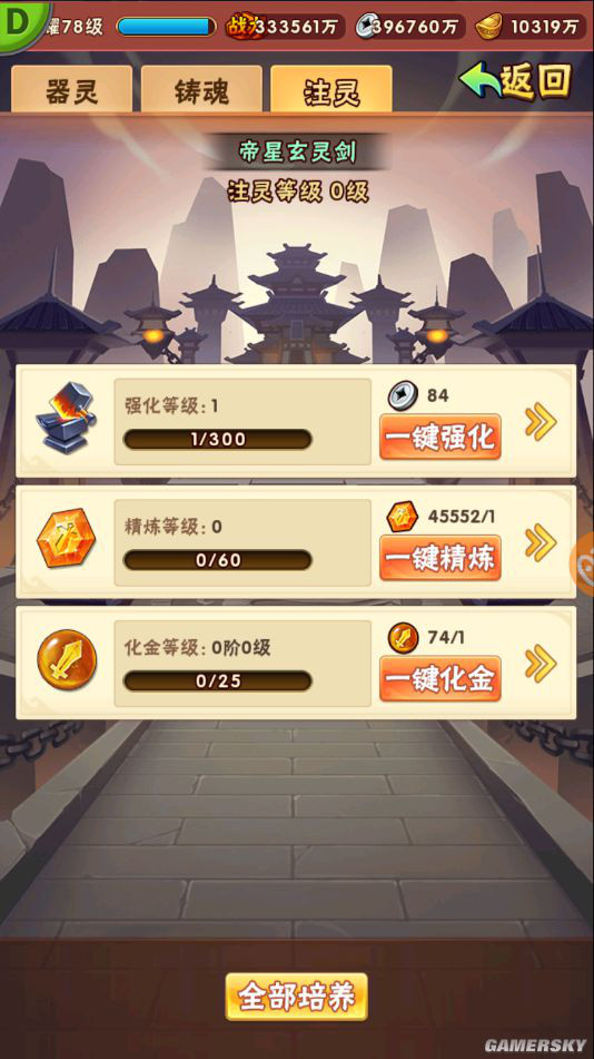 玩家通过消耗红、暗金、彩金装备碎片,使琉金装备获得魂值,达到足够的魂值即可提升等级;强化、精炼、化金整合至注灵界面,玩家一键全部培养,解放双手!