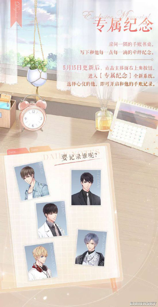 5月15日更新后,点击主界面右上角按钮,进入【专属纪念】全新系统。选择心仪的他,即可开启和他的手账记录。玩家可以亲手写下与他的回忆日记,选择与他有关的纪念物装扮书桌,自由搭配与他有关的组合称号,展现最特别的你。同时累计与他的羁绊值,还可以领取短信、朋友圈、电话和全新称号奖励。
