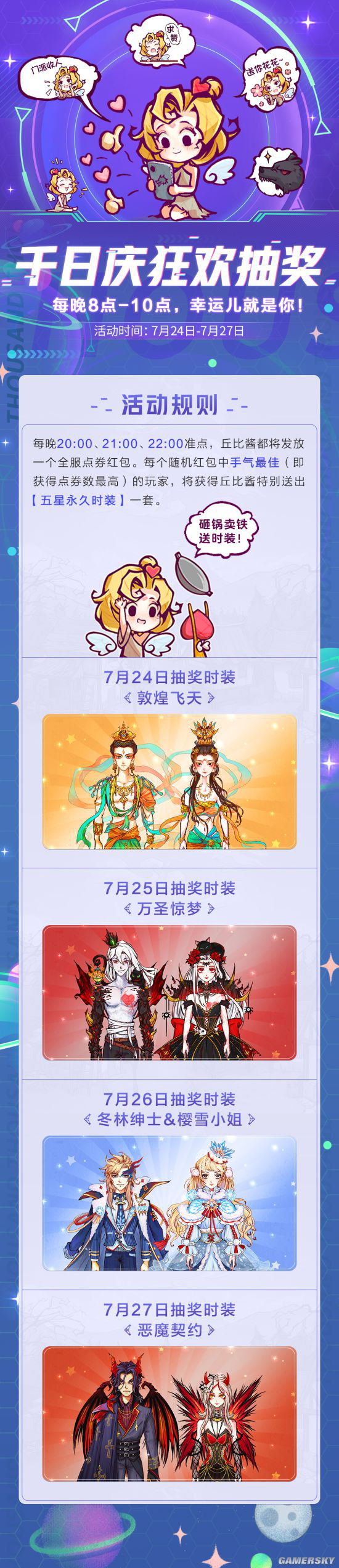 7月24日-7月27日期间,每天晚上20:00、21:00、22:00准点游戏内都会发放一个全服红包,每个随机红包中手气最佳的玩家还将获得一套永久五星时装,包括敦煌飞天、万圣惊梦、恶魔契约等经典款式。